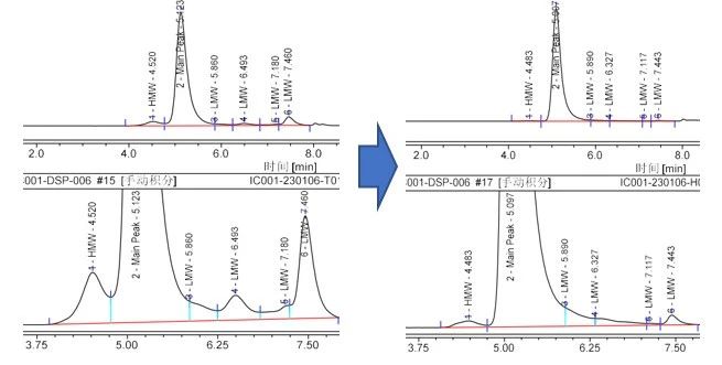 漢騰生物研發(fā)的IgM幾乎無六聚體,減少了這方面的工藝開發(fā)難度。但另一方面,IgM溶解范圍較窄,為其純化帶來了比較大的困難。漢騰生物IgMasterTM工藝平臺的技術(shù)路線可以有效解決此難題,純化方式根據(jù)第一步驟的區(qū)別主要有親和層析和非親和層析兩種。這兩種方式都可以達到97%以上純度,殘留的宿主細胞蛋白(HCP)水平都控制的比較好(HCP<100ppm),回收率達到>55%,讓工藝成本及效益達到較理想的狀態(tài)。