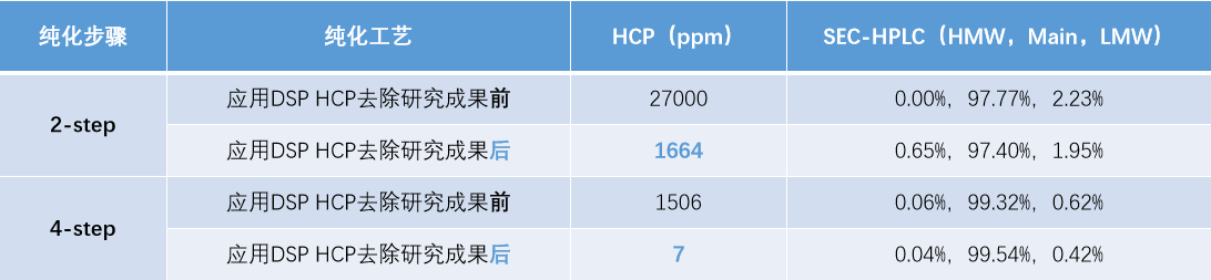 無論采用2步層析工藝抑或4步層析工藝,應用DSP關(guān)于HCP去除的研究成果后,此項目產(chǎn)品中的HCP殘留均大幅下降,SEC純度保持不變。有效清除了工藝殘留雜質(zhì)(HCP 低于10ppm;對比已上市同類別產(chǎn)品的900ppm有顯著下降)。